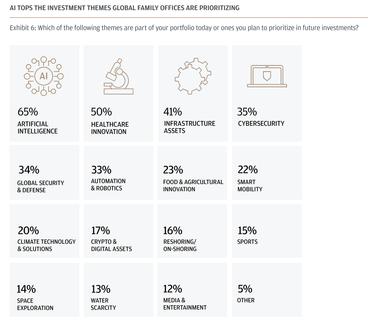 Artificial intelligence has emerged as the dominant investment theme for the world’s largest family offices, while cryptocurrencies continue to attract limited interest, according to a new report from JPMorgan Private Bank.