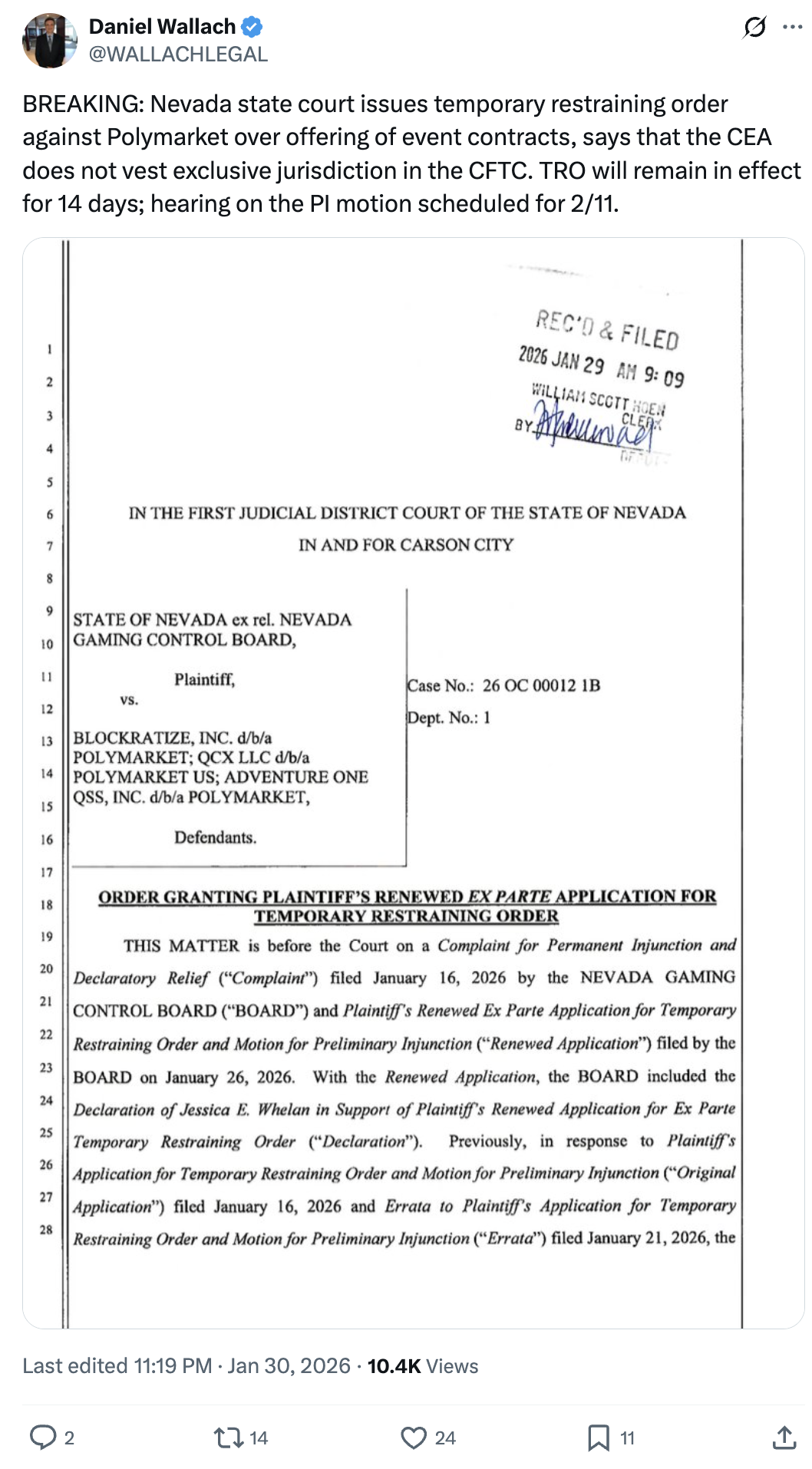 In a Thursday order seen by Cointelegraph, the court granted the Nevada Gaming Control Board a 14‑day temporary restraining order (TRO) against Polymarket operator Blockratize. The order bans Polymarket from offering event‑based contracts to Nevada residents while the case…