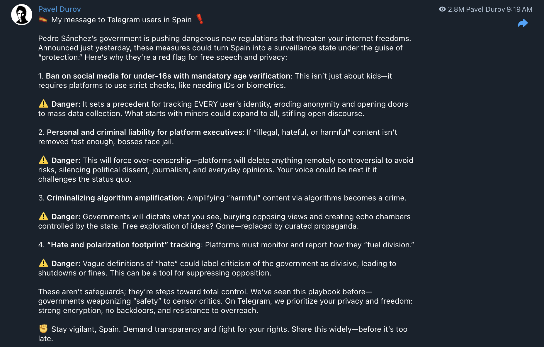 Home BlockchainTelegrams Durov Sounds Alarm About Spains Online Age Verification law