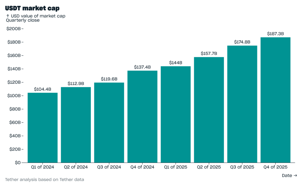 - Tether’s record-breaking $187B market cap indicates massive liquidity waiting to deploy into risk assets.